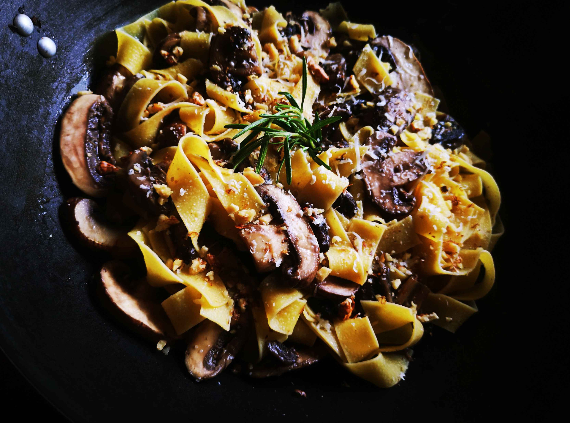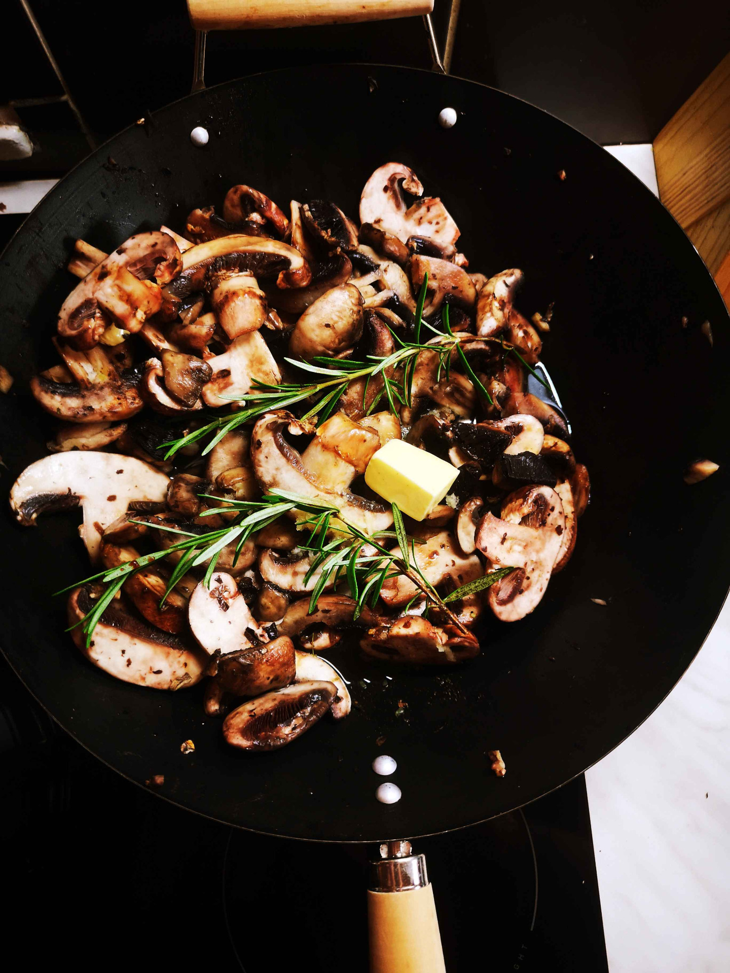 - Amint megpirult a gomba hozzáadjuk a maradék vajat, az apróra vágott fokhagymát, az alaplét, a bort, a balzsamecetet és a két szál rozmaringot. Sózzuk, borsozzuk és egy csipet chili pelyhet rakunk bele.