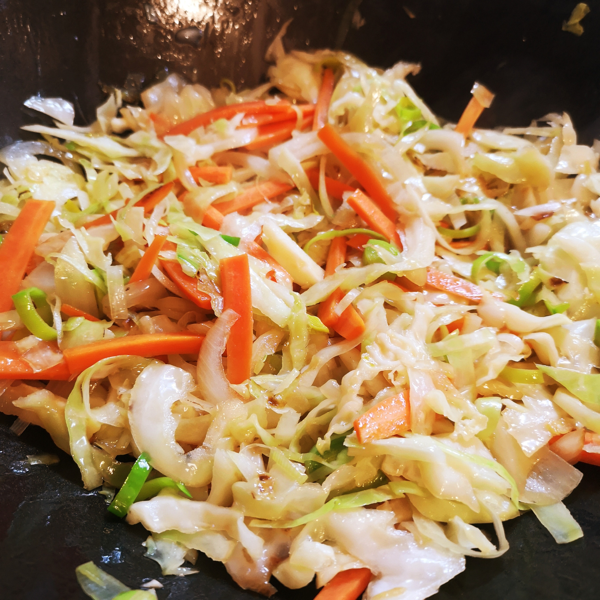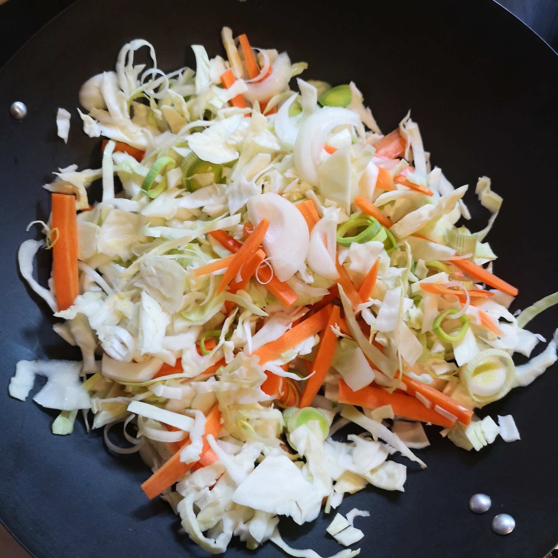 - A káposztát, a hagymát és a sárgarépát csíkokra vágjuk. A póréhagymát karikázzuk. Wokban (akinek nincs, magasabb falú serpenyő tökéletese helyette) olajat forrósítunk.