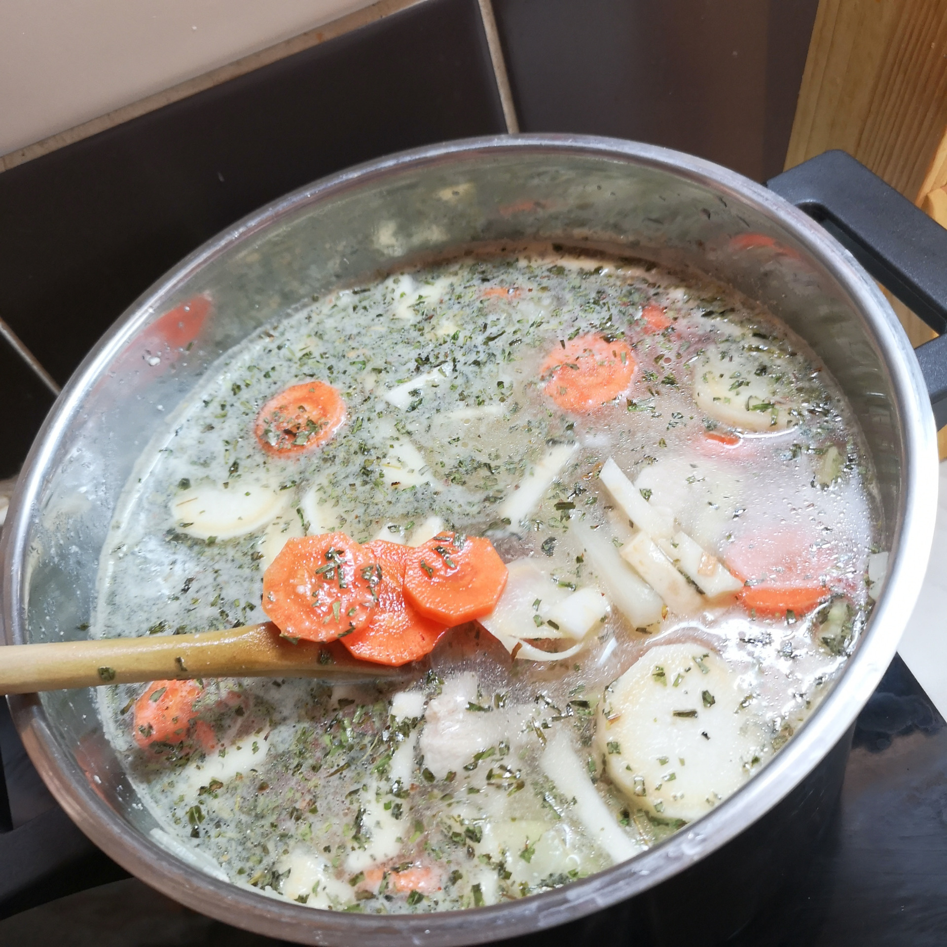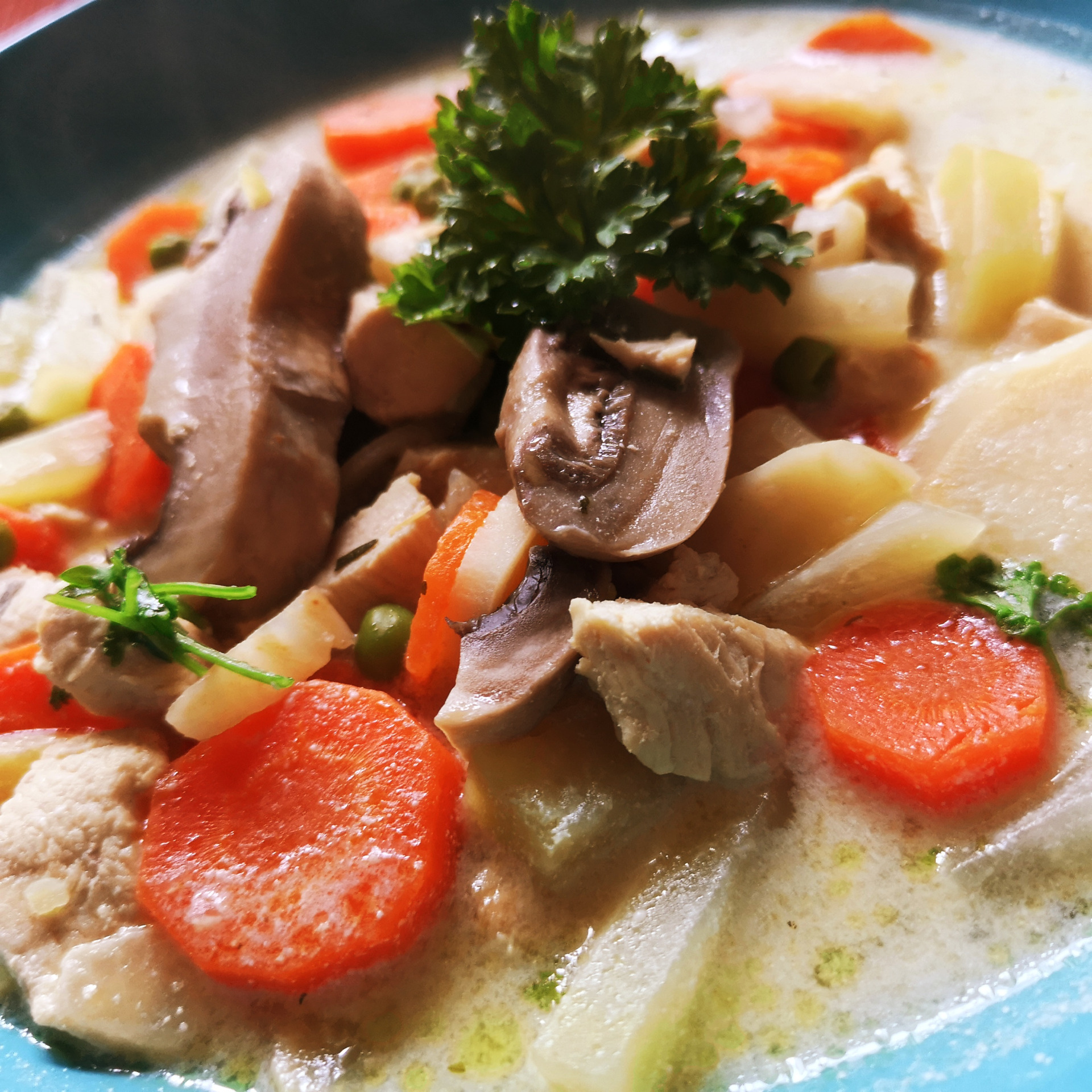 - Tálba öntjük a főzőtejszínt, hozzáadjuk a lisztet, ezt habverővel simára keverjük és rámerünk a levesünk levéből 2-3 merőkanállal. Ezzel is elkeverjük csomómentesre. Ezt a forrásban lévő leveshez adjuk. Forralunk még rajta egyet. Ekkor ízesítjük még a citromlével. Friss petrezselyemmel tálaljuk.