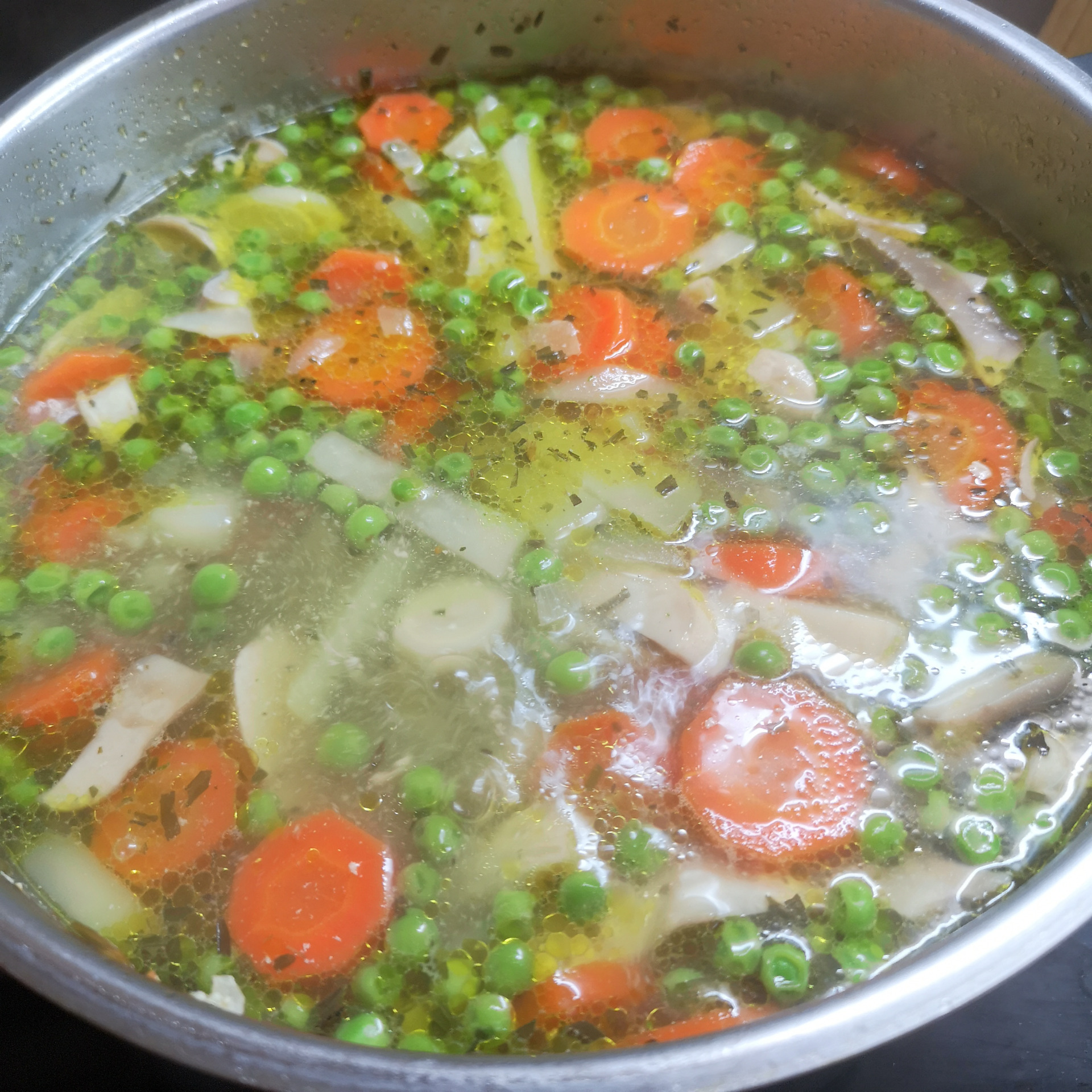 - Mikor forrt már egyet hozzáadjuk a gombát és a borsót. Addig főzzük, míg minden meg nem puhul.